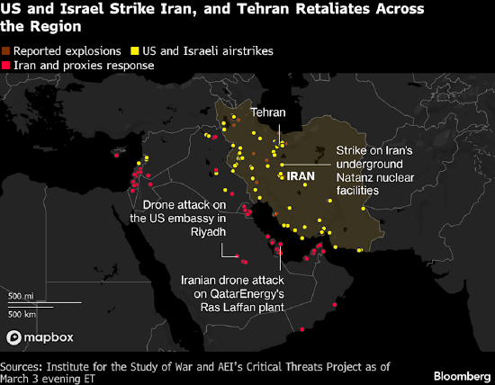 总共有约十几个国家卷入动荡,伊朗方面袭击了美国在中东各地的军事基地和大使馆,以色列则对黎巴嫩境内与伊朗结盟的真主党发动了空中及地面进攻。土耳其周三也遭到袭击,这是动荡爆发以来北约成员国首次遇袭。北约防空系统击落了一枚从伊朗方向发射的弹道导弹,土耳其方面警告伊朗不要采取可能导致战争进一步扩大的行动。