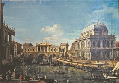 与此同时,除了刻画肉眼所见的真实场景,卡纳莱托还擅画一种将实物与想象相结合的“随想画”。在卡纳莱托的《帕拉第奥建筑随想曲》中,他巧妙地将帕拉第奥修建于维琴察城的巴西利卡与基耶里凯蒂宫“移植”至威尼斯大运河畔,并将现实的里亚托桥替换为帕拉第奥当年设计的初版。画家通过“暗箱”技法精确描摹街道和建筑细节,并通过研究帕拉第奥的手稿图纸将后者的“建筑遗产”融入到这个虚构的画面中,以一种颇为浪漫的幻想形式对前辈大师致敬。