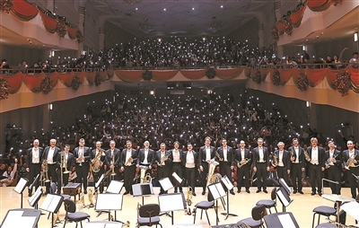 加演的第一首乐曲、《星球大战》中爵士乐风味浓郁的《酒馆小调》,让星际的浩瀚与尘世的烟火气交融。在《我的祖国》的亲切旋律响起的那一刻,在场的听众情不自禁地鼓掌。近年来国外乐团在我国音乐舞台上加演这首乐曲相当频繁,在爱乐铜管乐团演奏的改编版中,它显得与众不同。后半部分并没有采用进行曲节奏,因而更加感人。而出乎听者意料的还在于结尾:以嘹亮见长的铜管乐团没有在有力的强奏中响亮地结束,而是轻轻地、仿佛依依不舍地让音乐终结。这些了不起的铜管演奏家们在中国音乐中显示出令人喜爱和敬佩的艺术品位!