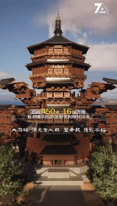 作为建筑美学爱好者的@见筑师,利用AI技术动态拆解大雁塔、佛光寺、黄鹤楼的榫卯结构。