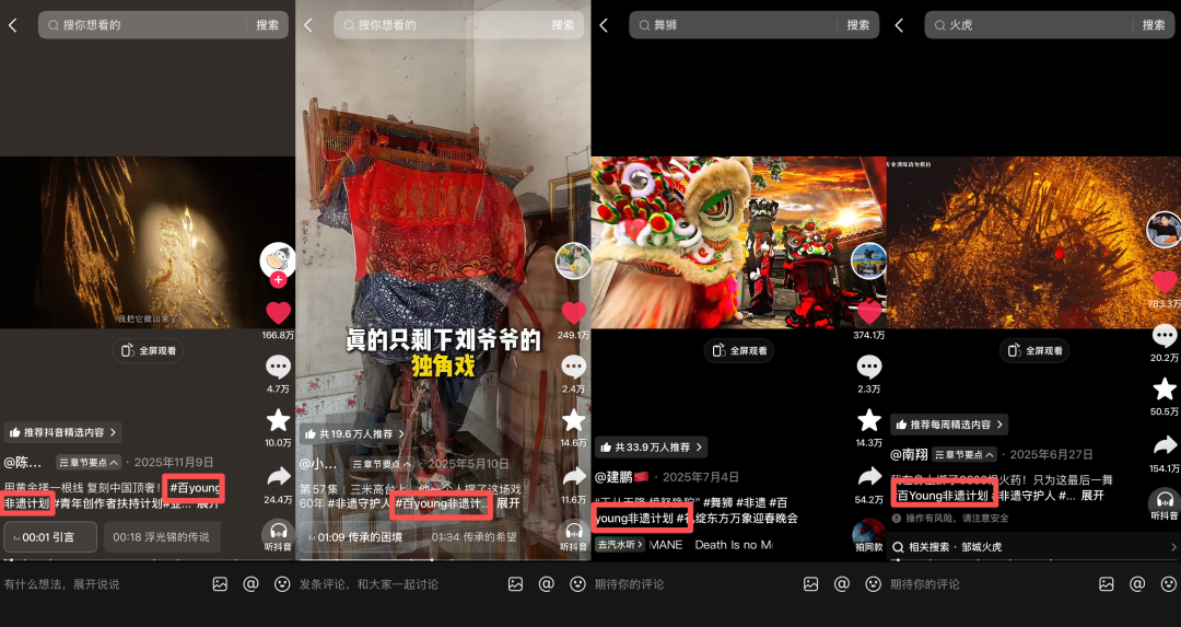 针对这一现状,抖音推出「百young非遗计划」,不仅为@凌云 @在下曼妥思 等创作者的非遗内容送上流量扶持,更通过联动文旅部、联合国教科文组织等官方机构和顶级品牌,发起非遗活动,从根本上解决小众非遗的 “曝光难” 痛点。