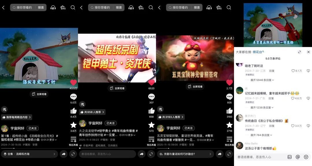 在他的「超传统京剧」系列视频下,《迪迦奥特曼》《猪猪侠》《铠甲勇士》等年轻人的童年回忆,全都被改编成韵味十足的京剧唱段。