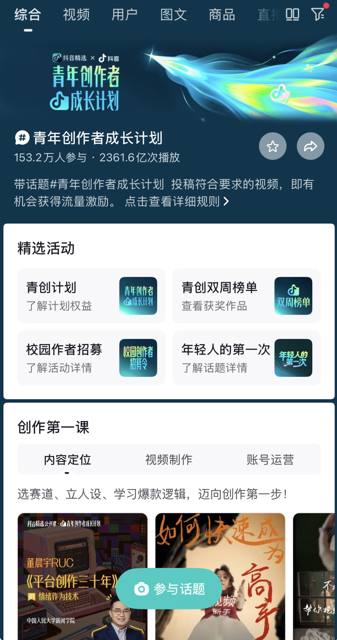 「青年创作者成长计划」则针对年轻创作者“起步难”的困境,与全国百所高校联合发起,并构建了“创作课程、流量体系、商业变现、线下社区与创作舞台五大模块”的一站式孵化体系。