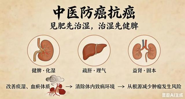 中医防癌、抗癌强调“见肥先治湿,化湿先健脾”,通过调理脾、肝、肾功能,改善痰湿、血瘀体质,清除体内致病环境,从根源上减少肿瘤发生风险。