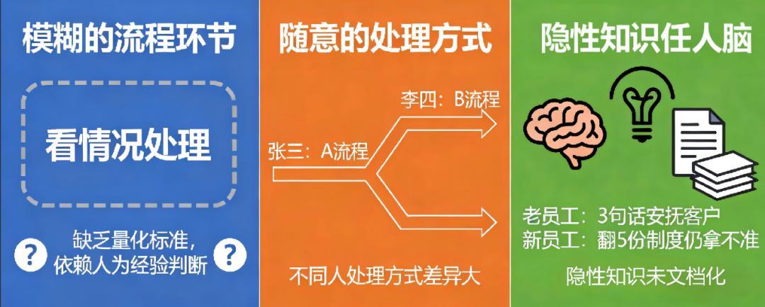 模糊的:很多环节“看情况处理”,也就是说需要人为经验判断,缺乏量化标准;