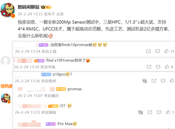 据CNMO了解,该博主曾爆料过一款全新的2亿像素传感器正处于测试阶段,其评论区多数网友猜测这颗传感器将落地OPPO Find X10 Pro Max。