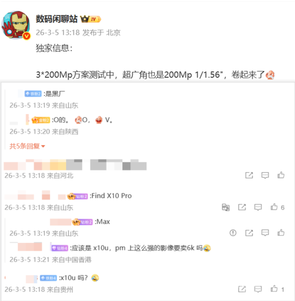 【CNMO科技消息】3月5日,数码博主“数码闲聊站”爆料称,3摄2亿像素镜头方案正在测试中。其中,超广角镜头为2亿像素,传感器尺寸为1/1.56英寸。结合博主暗示表情与网友推测,该配置大概率将搭载于OPPO Find X10系列机型。