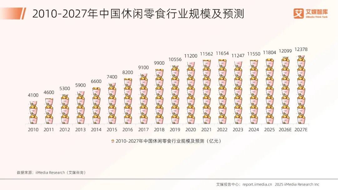 调研机构艾媒咨询数据显示,2025年中国休闲食品行业规模为11804亿元,预计2027年将达12378万亿元;国内消费者购买休闲食品的频率,占比最高的是每月7-8次,为32%,其次是每月9-10次,占比23%。