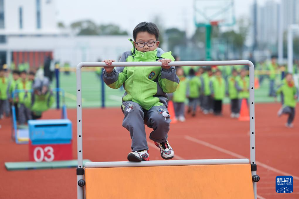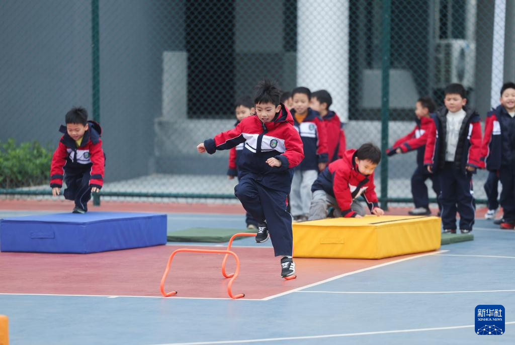 3月5日,嘉兴市实验小学亚欧校区的学生们参加开学第一课跑酷运动训练。