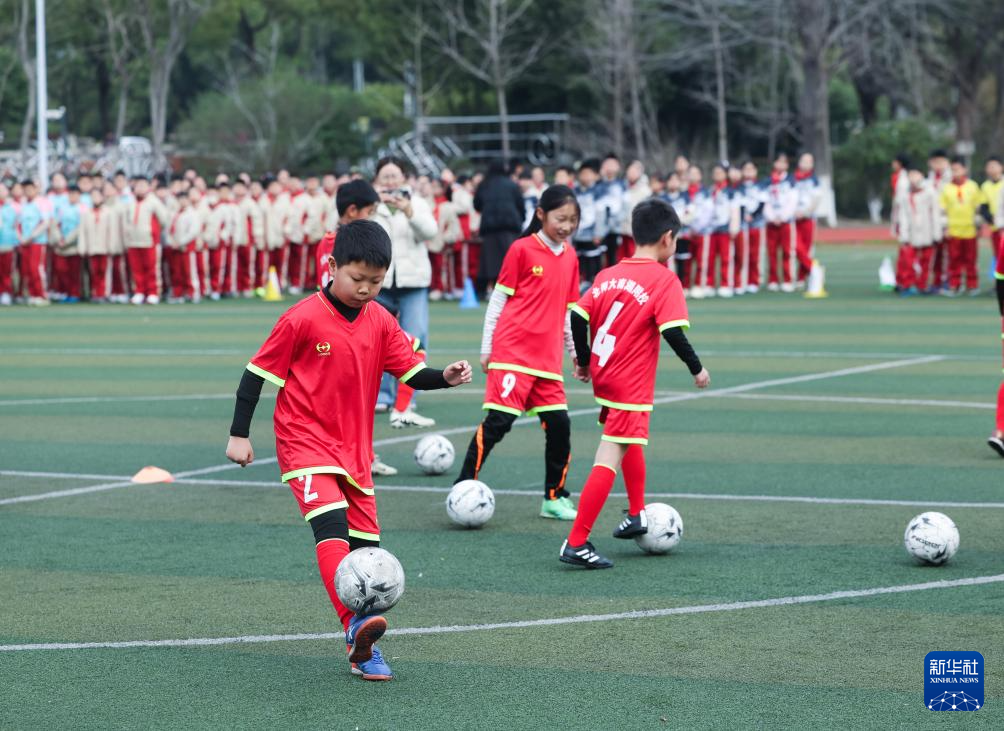 3月5日,北京师范大学南湖附属学校的学生们在参加开学第一课足球训练。