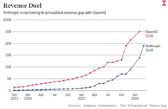 OpenAI 的营收仍高于其竞争对手 Anthropic,但两家巨头之间的差距正在快速收窄: