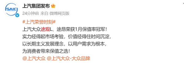 【CNMO科技消息】3月5日,上汽集团官方宣布,旗下上汽大众途观L、途昂双双斩获2026年1月保值率冠军。根据官方发布的图片信息,途观L荣获20-25万合资中型SUV三年车龄保值率冠军,途昂则斩获主流合资中大型SUV三年车龄保值率冠军。