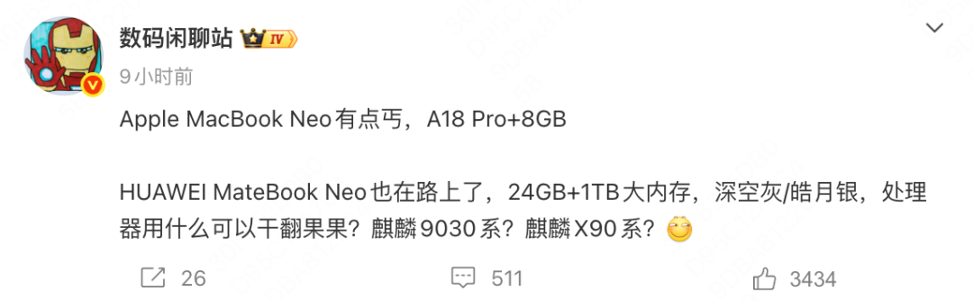 就在MacBook Neo因内存容量问题引发市场讨论之时,知名数码博主@数码闲聊站透露,华为方面正在筹备推出MateBook Neo,并且该机在存储规格上将明显拉开差距。