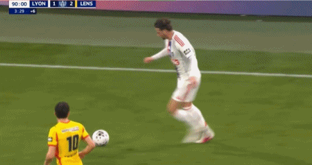 第90+4分钟,里塞出击失误,安贝尔吊射破门将比分扳平,里昂2-2朗斯