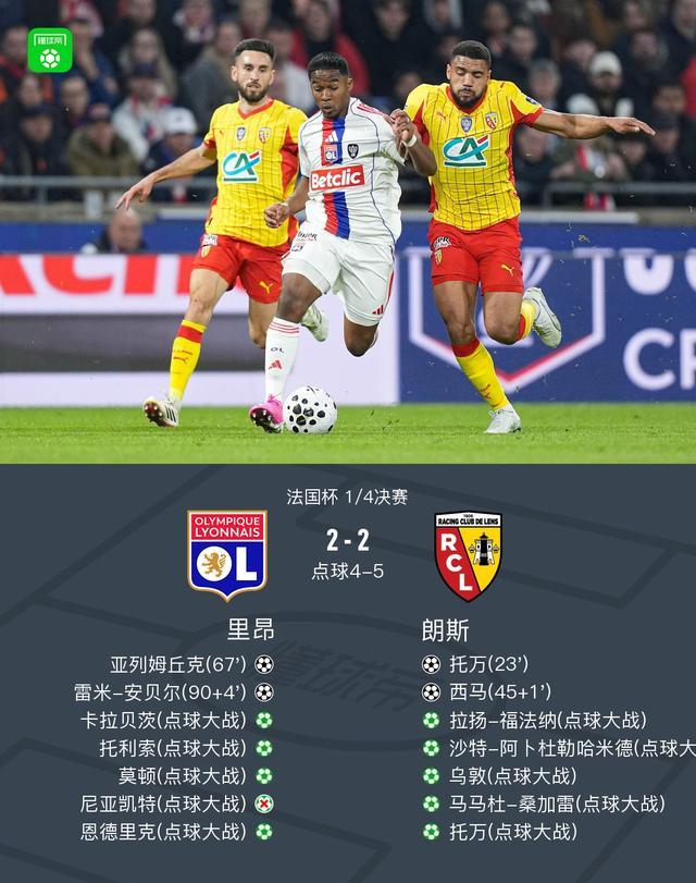 北京时间3月6日法国杯 1/4决赛,里昂对阵朗斯。里昂亚列姆丘克破门,雷米-安贝尔破门。朗斯托万破门,西马破门。常规时间双方战平,进入点球大战。点球大战,朗斯5-4战胜里昂。最终,朗斯7-6里昂挺进法国杯四强。