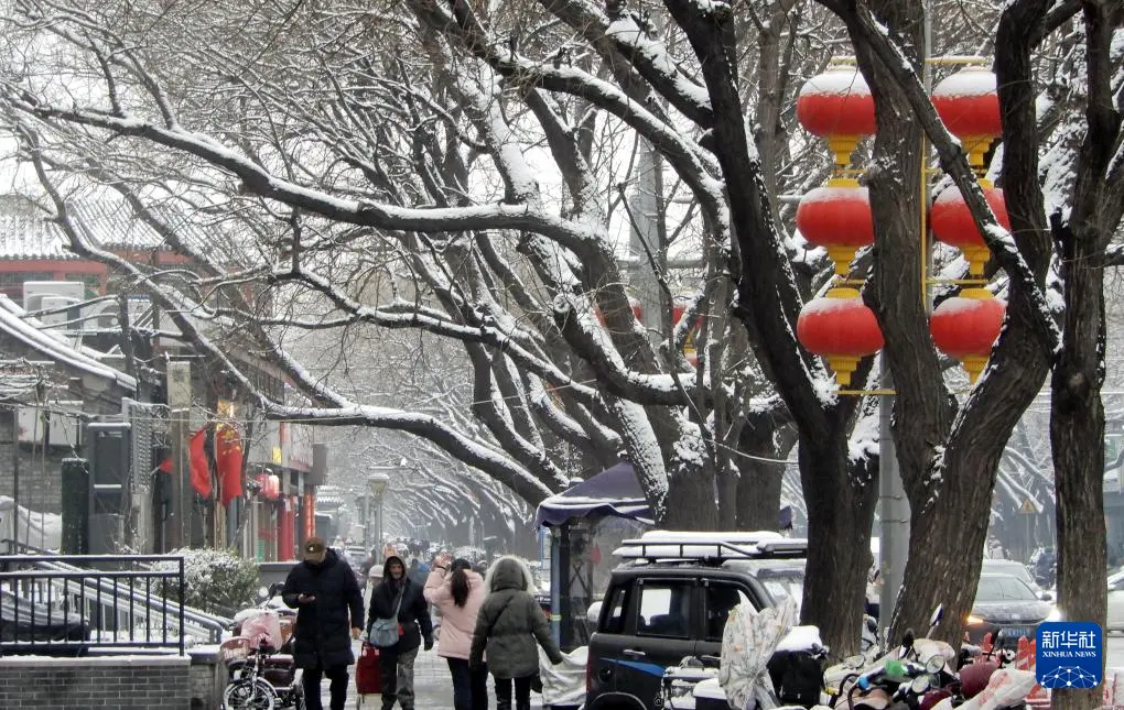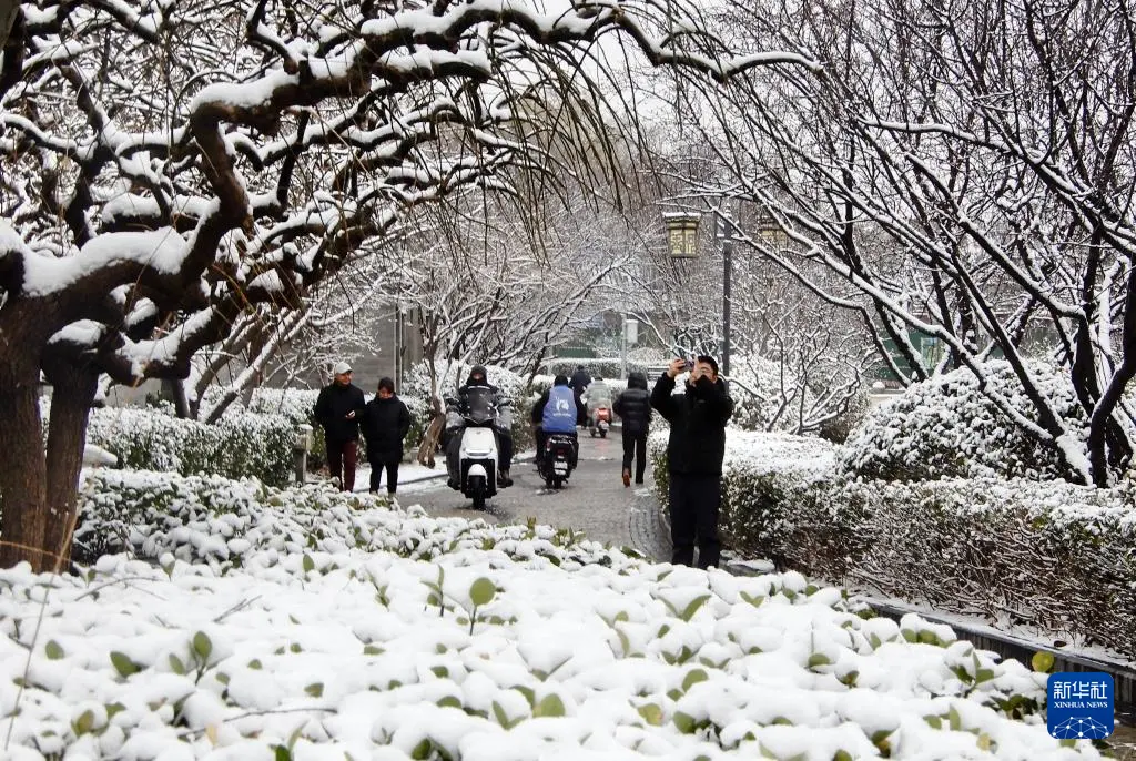 3月5日,行人在北京宣武门西大街路边拍摄雪景。