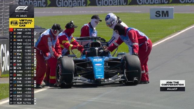阿尔本赛车液压故障,失去动力停在了10号弯,虚拟安全车出动。