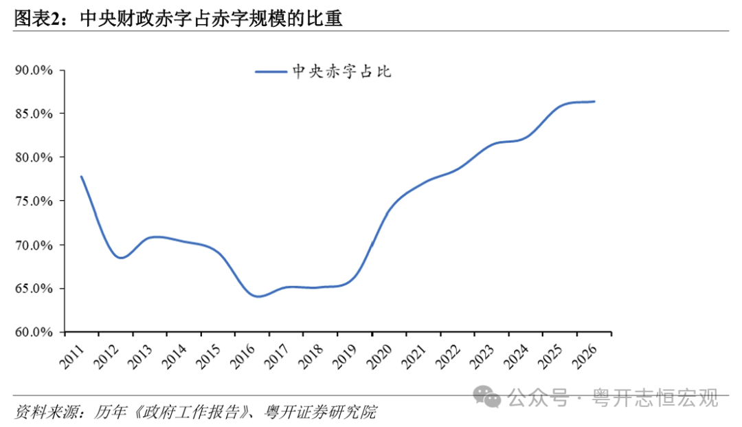 其二,赤字结构中中央赤字占比明显提高,中央赤字占比接近九成,中央加杠杆既减轻了地方负担,又优化了央地债务结构。2026年的赤字规模5.89万亿,较2025年增加的2300亿元全部由中央负担,由此赤字结构中中央占比为86.4%;再考虑到超长期特别国债和特别国债,当年新增债务中中央、地方债务分别为6.69万亿和5.2万亿,分别占比56.3%和43.7%,反映出鲜明的中央加杠杆特征。中央举债的部分资金以转移支付的形式给到地方,有利于减轻地方财政负担,同时也优化了央地债务结构。