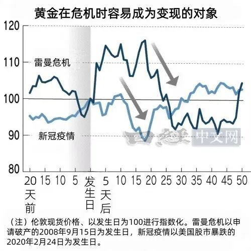 2008年雷曼危机引发市场陷入混乱时,金价一度升至900美元区间,但随后急跌至600美元区间,市场上出现了通过抛售黄金来获取现金的动向。美国雷曼兄弟于9月15日申请破产保护,不过随着股价在10月以后加速下跌,黄金也开始被抛售。