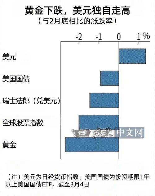 在外汇市场上,与上周末相比,美元对除大洋洲货币之外的几乎所有主要货币均出现上涨。综合衡量货币价值的名义有效汇率指标“日经货币指数”显示,截至3月4日,美元较上周末上涨1.3%,在主要25种货币中涨幅居首。