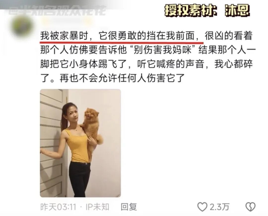 “我被家暴时,它很勇敢的挡在我前面,很凶的看着那个人,仿佛要告诉他:别伤害我妈咪。结果那个人一脚把它小身体踢飞了,听它喊疼的声音,我心都碎了,再也不会允许任何人伤害它了。”