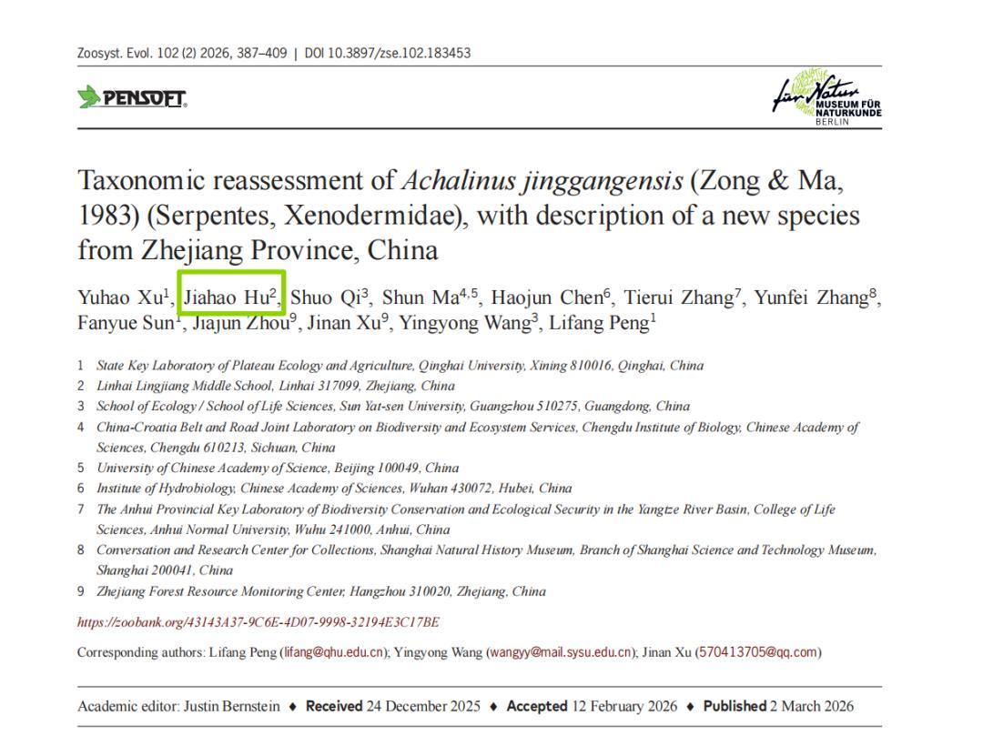 3月3日晚间,浙江临海高三学生胡家豪在朋友圈晒出了国际期刊《Zoosystematics and Evolution》新鲜出炉的一篇论文截图,论文内容是浙江临海发现的爬行动物新物种——括苍山脊蛇。