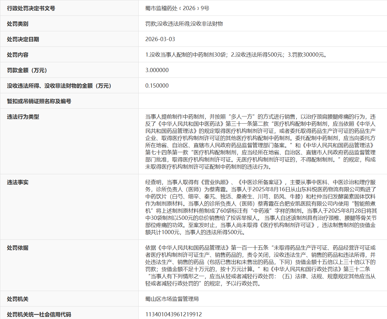 近日,据“信用安徽”公开披露行政处罚信息,未取得医疗机构制剂许可证违法制售制剂,合肥金石康中医诊所有限公司蜀山中医诊所被处以罚款30000元,被没收违法所得500元。行政处罚决定书文号是蜀市监稽药处﹝2026﹞9号。