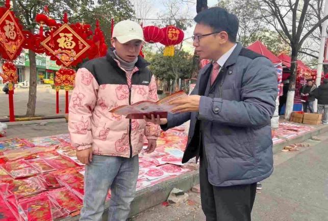 宣传现场年味浓郁、人气旺盛。街边灯笼铺张灯结彩,周边水果店客流不断,市民购置年货、走访亲友,正是普法宣传的黄金时机。宣传小分队主动上前,向置办年货的市民、经营商户、群众耐心讲解,重点围绕出租出借银行卡、账户转借牟利、可疑转账陷阱等常见风险,结合真实案例拆解骗局套路,提醒群众妥善保管身份证、银行卡及验证码,坚决不做违法犯罪“工具人”。