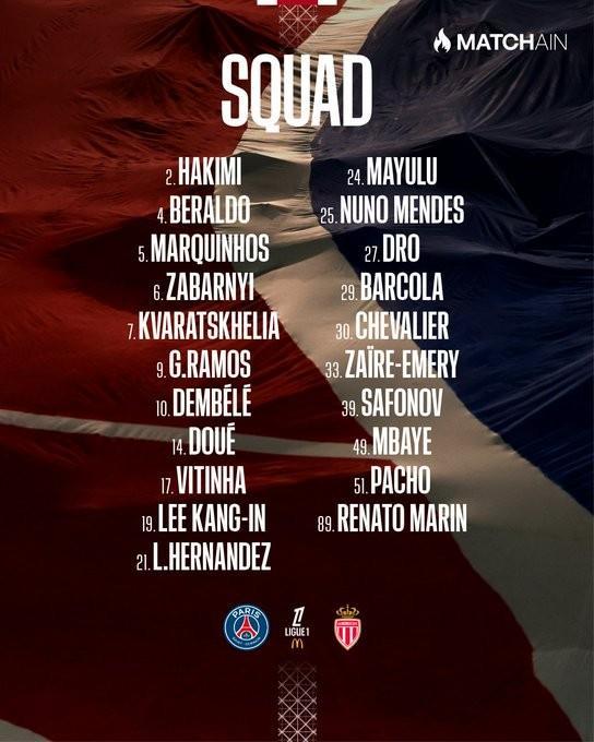 北京时间明天凌晨03:45,巴黎将迎来法甲第25轮主场对阵摩纳哥的比赛,赛前,巴黎官方公布了本场比赛的大名单,其中法比安-鲁伊斯、若昂-内维斯伤缺,登贝莱、马尤卢回归。