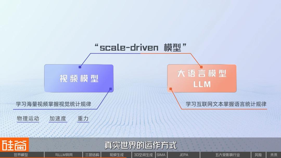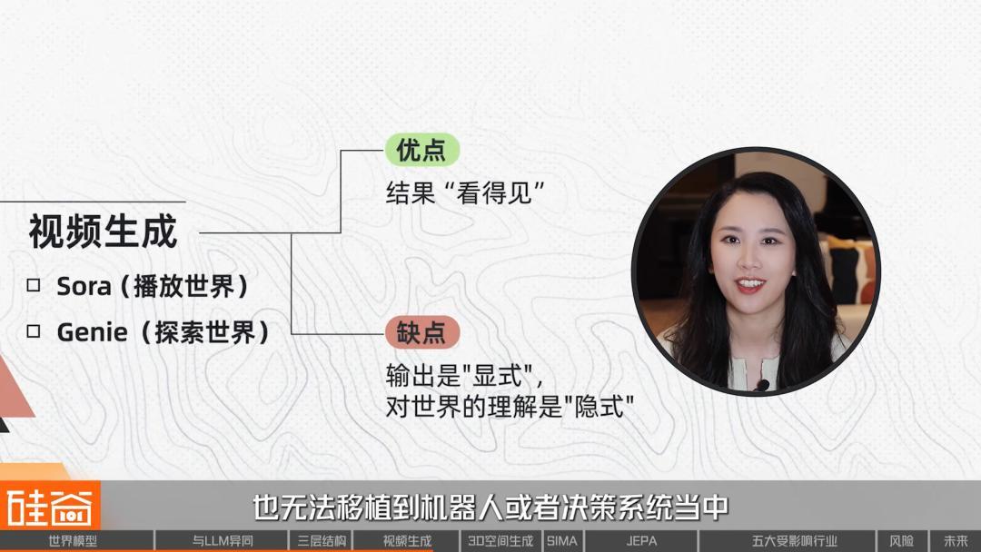 所以视频生成虽然是目前最直观、最能应用落地的一步,但它目前也只是画出了世界的一层皮,但还缺少有血有肉的框架。那如何才能勾勒出世界表层下的框架呢?