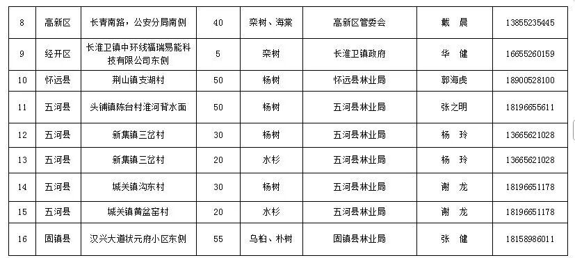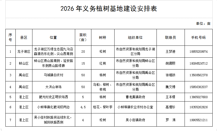 据介绍,今年,蚌埠市域范围内统筹设立了16个义务植树基地,共计面积448.5亩,主要栽植杨树、女贞、栾树、榉树等适应性强、效益较好的乡土树种。
