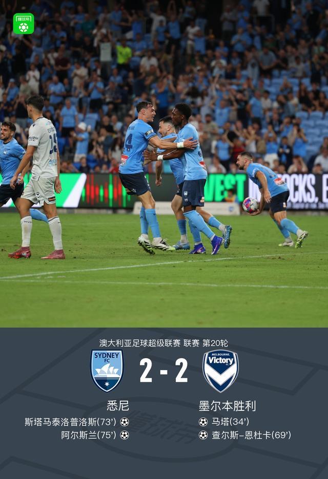 北京时间3月7日澳大利亚足球超级联赛第20轮,悉尼主场对阵墨尔本胜利。比赛中,墨尔本胜利球员马塔率先破门;随后查尔斯-恩杜卡再下一城;悉尼此后连扳两球,斯塔马泰洛普洛斯接、阿尔斯兰分别建功。最终两队战成平局,悉尼2-2墨尔本胜利。