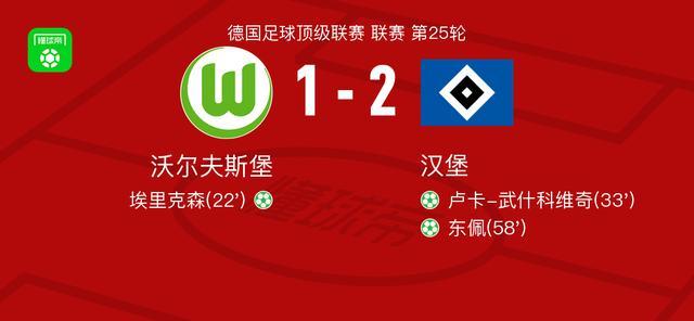 北京时间3月7日德国足球顶级联赛 联赛 第25轮,沃尔夫斯堡主场对阵汉堡。沃尔夫斯堡埃里克森破门。汉堡卢卡-武什科维奇破门,东佩破门。最终比分沃尔夫斯堡 1-2 汉堡。