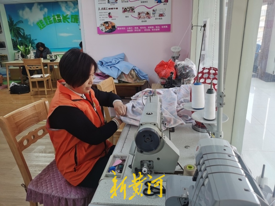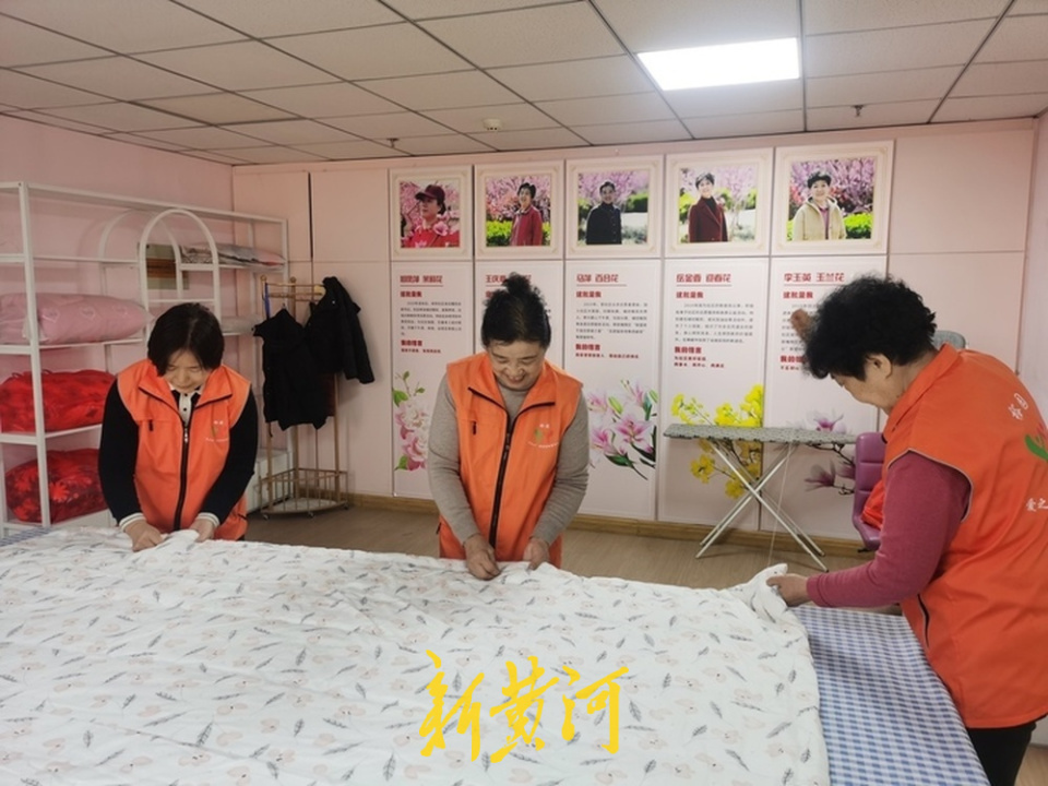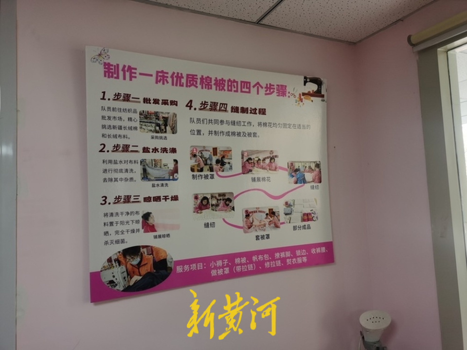 在墙边,一张“制作一床优质棉被的四个步骤”的宣传板格外醒目:批发采购、盐水洗涤、晾晒干燥、缝纫制作。马萍一边捋着被角一边说,她们专门去纺织品市场挑新疆长绒棉和棉绒布,回来放在洗衣机里用盐水洗净,等布料晾干晒透,才动手缝制。“不只是咱社区的人,连山师那边的人都来找我们做被子,说咱做的盖上特别舒服。一年下来,怎么也得做个百余床吧。”