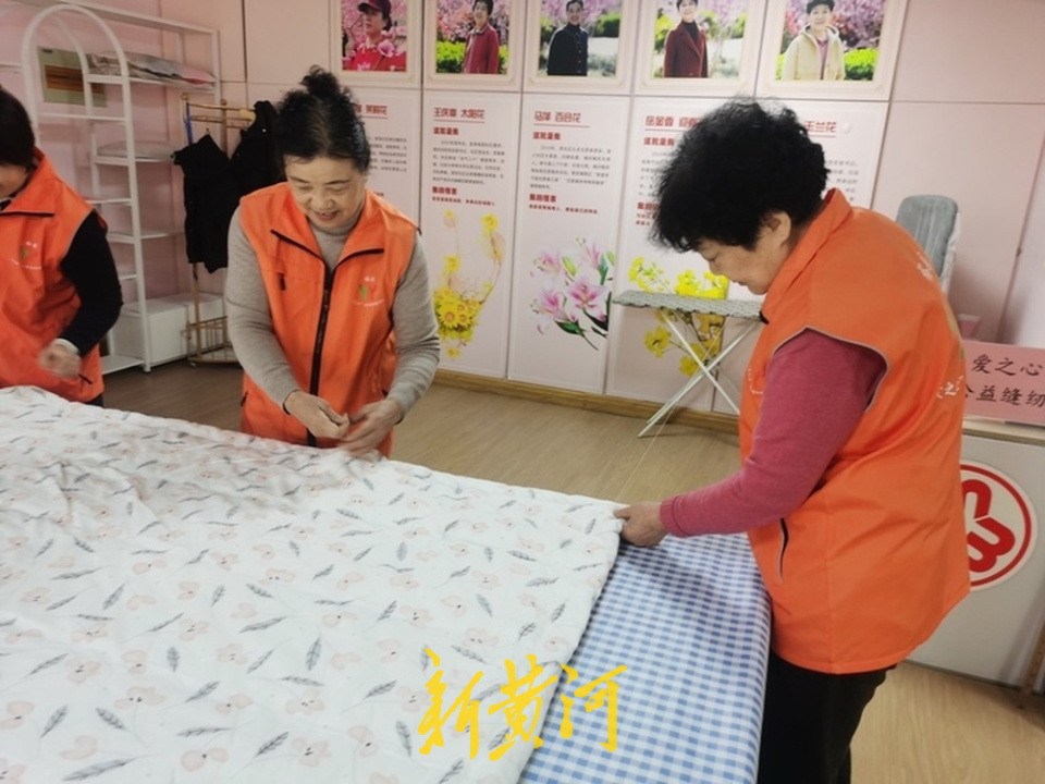 2月27日,新春的年味还未消散,年逾七旬的马萍便和服务队的姐妹们聚在一起了。她们的工作“车间”,位于裕园社区党群服务中心二楼活动室。只见她和其他3名姐妹围在一张大桌子四周,低着头认真地缝制一床被子。与新春前两个月相比,现在还比较清闲。“春节前是我们最忙的时候,当时买了两大包60多斤棉花,已经全部用完了。”她头也不抬地说着,手中的针线不停穿梭,有时候一上午就能做完5床被子。