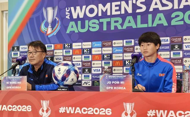 北京时间3月8日,女足亚洲杯小组赛朝鲜vs中国的赛前新闻发布会在西悉尼体育场进行。朝鲜女足主教练李成镐携队员赵凡美出席。