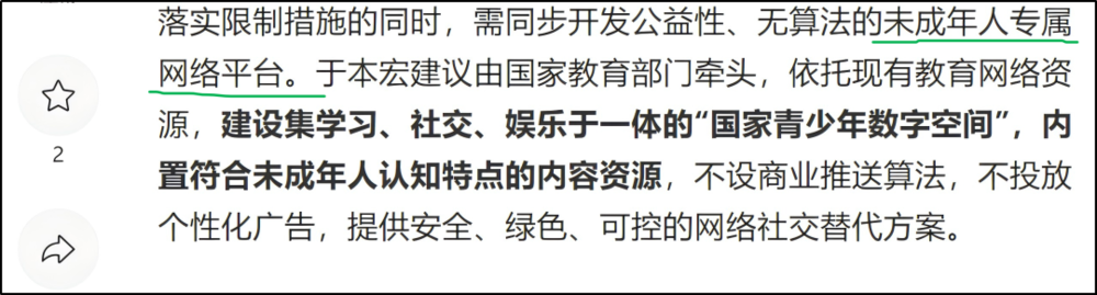 专家提了两点:建设一个青少年专属数字空间,开通监护人关联功能,这样孩子就能绿色上网。