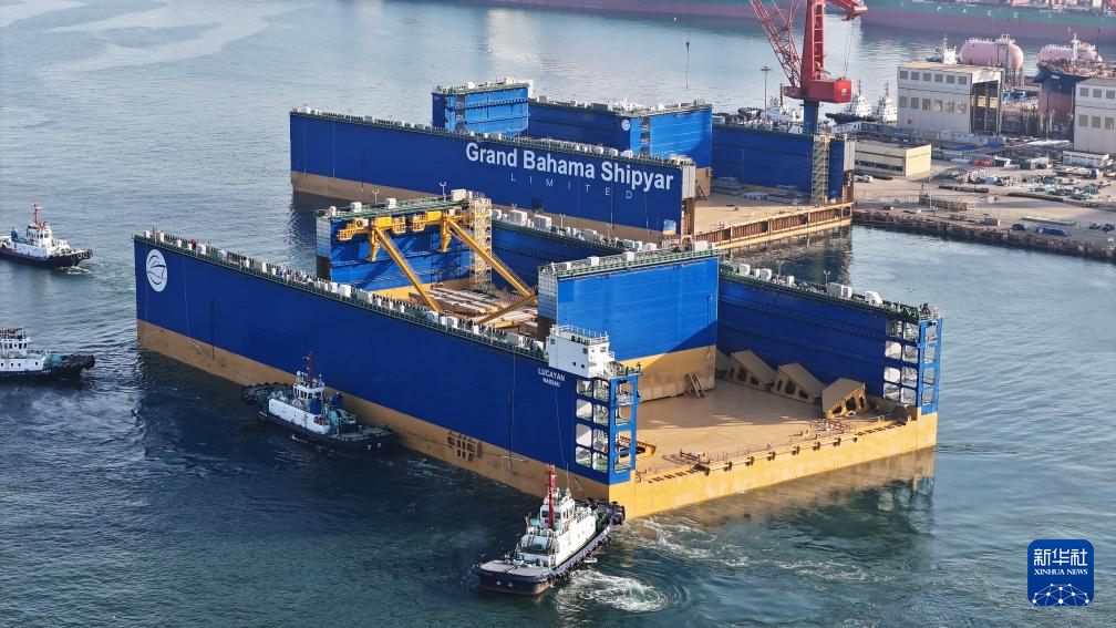 3月8日,12万吨举力浮船坞“Lucayan”号首段,从青岛西海岸新区北海造船3号码头离港(无人机照片)。