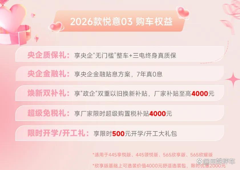为了让更多家庭轻松拥有这份“悦意”,2026款悦意03还重磅推出央企五重礼遇。购车即享央企质保礼,“无门槛”整车及三电终身质保真诚以待,更有7年真0息央企金融礼,极大降低拥车门槛,同时,新车叠加焕新双补礼,政企双重以旧换新补贴至高4000元,以及限时4000元购置税补贴的超级免税礼、限时500元的开学/开工礼。特别值得一提的是,还有限时半价权益,可升级价值4000元的舒适选装包(具体优惠政策请详询当地经销商)。在这个女神节,让爱与梦想零负担启程。