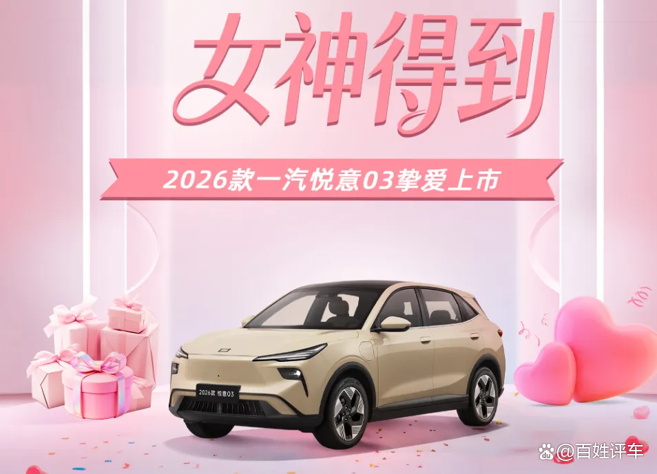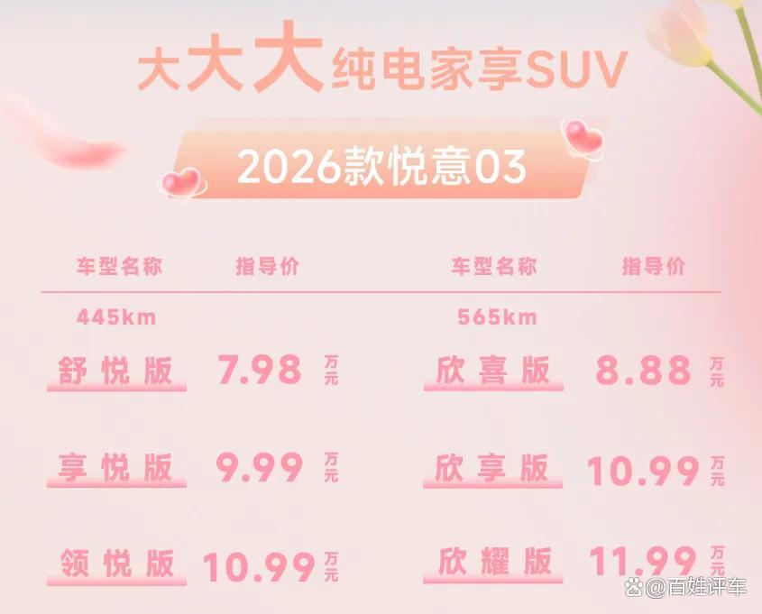 三月春暖,悦见花开。3月8日妇女节,实力演员张若昀直播助阵,“大大大纯电家享SUV”焕新而来,2026款悦意03挚爱上市,为每一位女神献上春天的礼物。445km、565km两种续航共计6款车型,官方售价7.98-11.99万元。围绕年轻小家庭,尤其是家庭女性用户的进阶需求,从颜色推新到舒适满配,2026款悦意03带来全新晨晖金车色、晨曦白内饰色等20余项升级,让用车更舒心、开车更省心、养车更安心,正如张若昀所说:“悦意03是真舒适的纯电SUV。”当前购车还可享7年0息贷款、无门槛整车及三电终身质保等丰富权益,轻松开启高品质纯电生活。