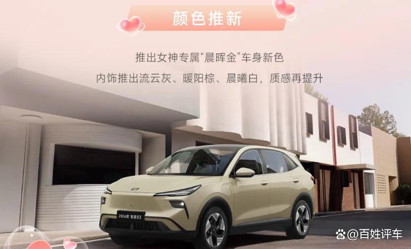 颜色推新,是她第一眼的喜欢。 女神选车,眼缘很重要。2026款悦意03新增的晨晖金车色,像清晨第一缕阳光洒在肩上,温柔不张扬,却足够精致,是停下车,忍不住回头多看两眼的喜欢。全新晨曦白内饰则干净通透,搭配双拼纹理座椅,指尖触到的质感,是给自己的犒赏。