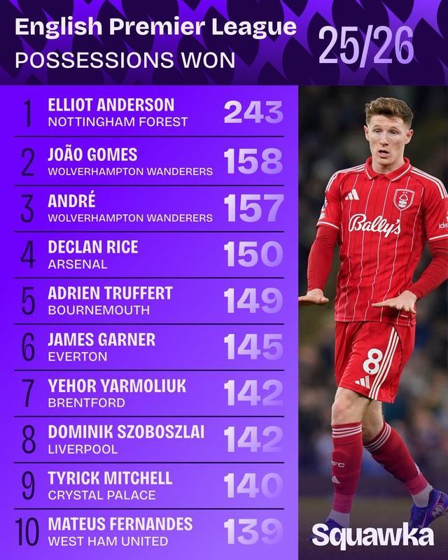 北京时间3月9日,知名数据机构Squawka统计出了本赛季至今英超球员赢得球权次数排行榜,诺丁汉森林中场埃利奥特-安德森以243次断档领先,赖斯和索博斯洛伊进入前10。