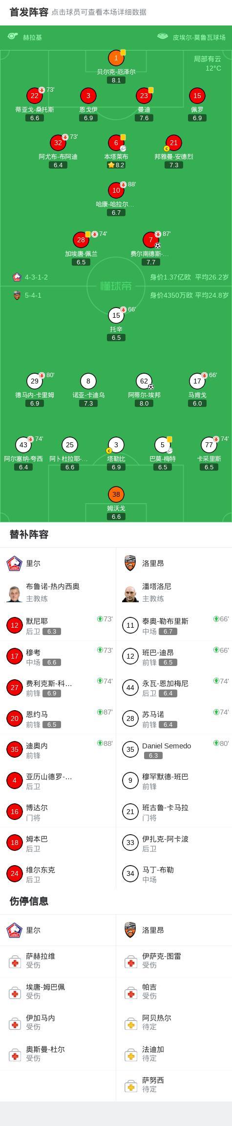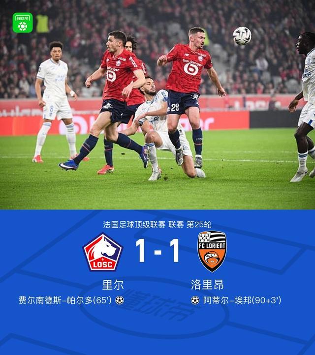 北京时间3月9日,法国足球甲级联赛第25轮,里尔主场对阵洛里昂。比赛中,帕尔多打破僵局,阿蒂尔-埃邦补时阶段天外飞仙绝平。最终比分里尔1-1洛里昂。