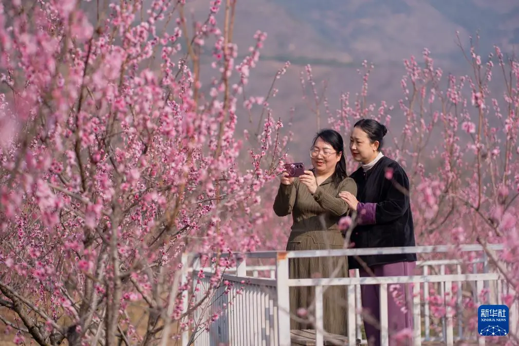 3月7日,在云南省大理白族自治州洱源县茈碧湖畔,游客在桃园赏花拍照。