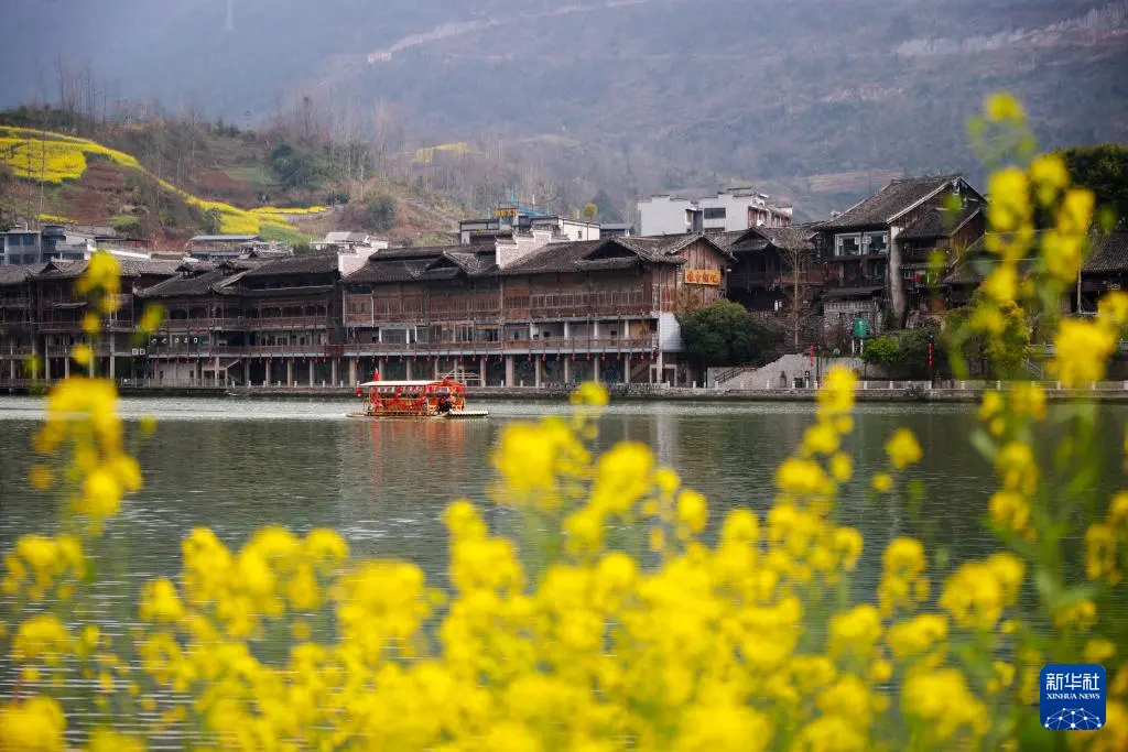 3月6日,游客在重庆市黔江区濯水古镇乘坐电动竹筏游览阿蓬江。