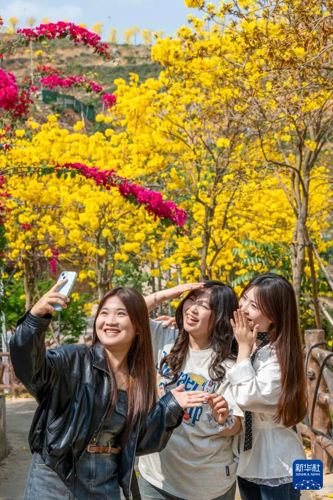 广西梧州市甜蜜家生态蜂业园连片的黄花风铃木盛放,游客在赏花拍照(3月7日摄)。
