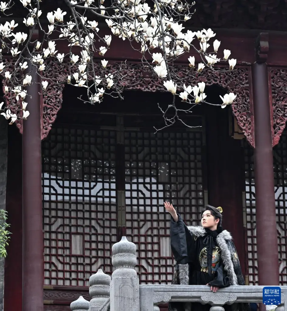 3月7日,身着古装的游客在江苏省南京市朝天宫景区与玉兰花合影。