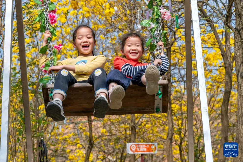 广西梧州市甜蜜家生态蜂业园连片的黄花风铃木盛放,小朋友在花下荡秋千(3月7日摄)。
