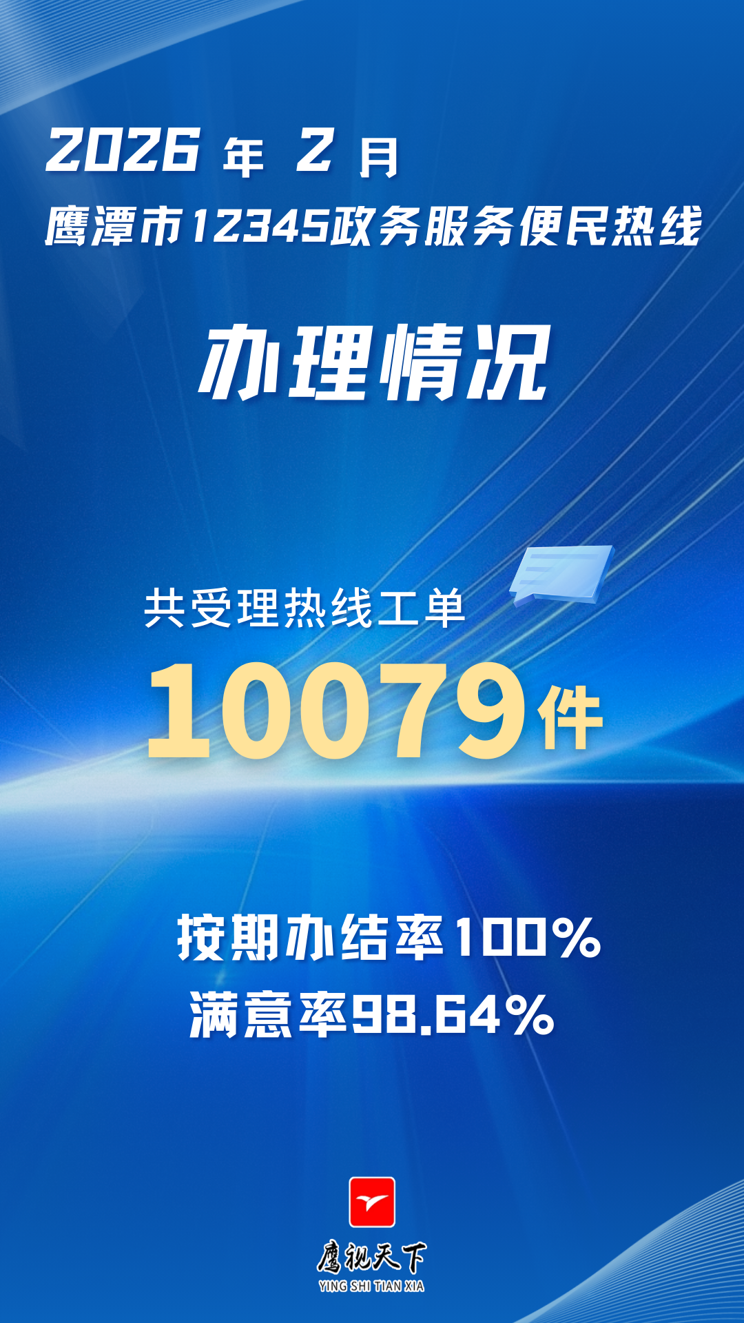 鹰潭市12345政务服务便民热线(3651890党群服务热线)共受理热线工单10079件,按期办结率100%,满意率98.64%。