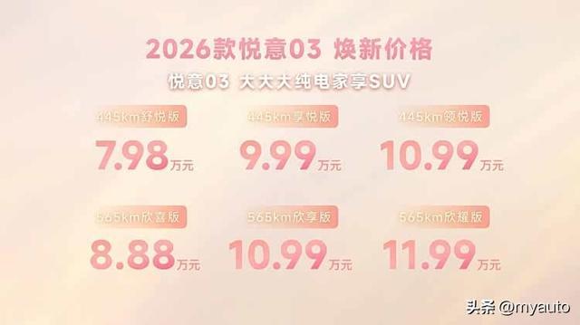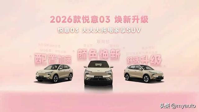 再有一点,2026款悦意03延续整车+三电终身质保,对于用户来说这就很有吸引力。从空间到续航以及配置和使用成本,2026款悦意03用体系化的硬核优势试图在比亚迪元PLUS、吉利银河E5等主流车型的牌桌上撕开口子,对于预算有限但既要、又要的用户来说,2026款悦意03显然更值得信赖。